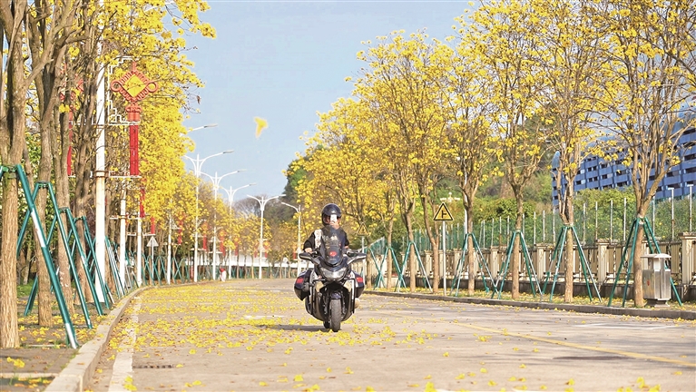 黄花风铃木树冠开阔、尾枝低垂、株型呈椭圆状的姿态、风姿绰约,远看浑然就是西式插花、氛围感十足、浪漫又璀璨。黄花风铃木因独具特色的景观,不知不觉中已成为我市观赏植物的顶流,每年三四月繁花满树时节,引得踏青赏花人纷至沓来。