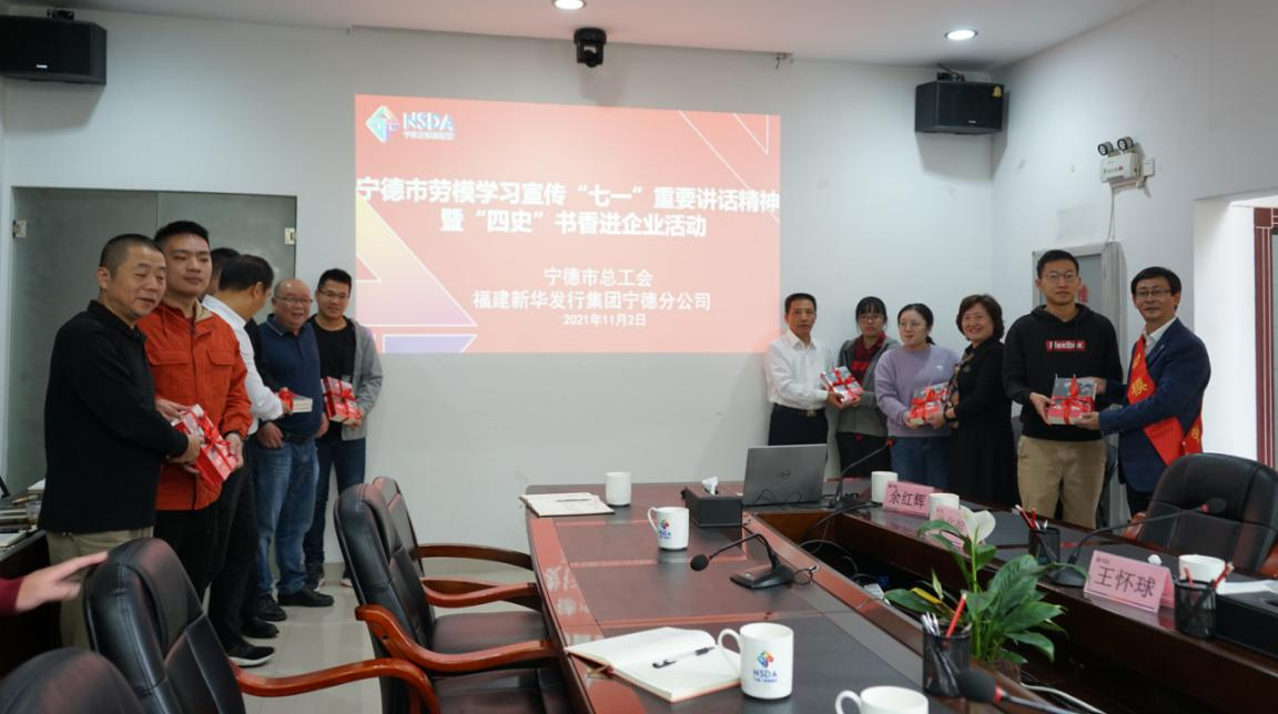11月2日,市总工会党组成员、三级调研赖文宫同志,劳模代表、2019年福建省五一劳动奖章、古田县委党校高级讲师余红辉同志,福建新华发行集团宁德分公司副总经理缪友文一行到我公司开展劳模学习宣传“七一”重要讲话精神暨“四史”书香进企业活动。公司党委委员、工会主席王怀球主持会议,公司本部及子公司干部职工参加宣讲会。