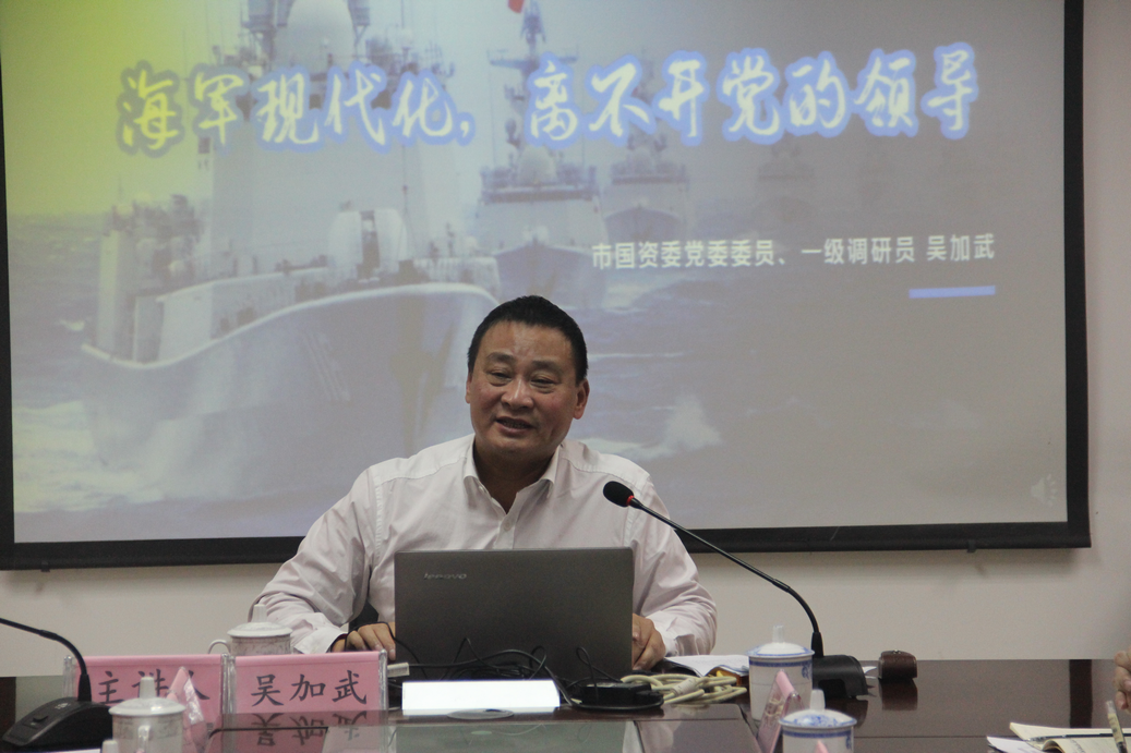 授课中,吴加武调研员用生动的语言、鲜活的事例,带大家系统的回顾了我国海军的发展历程,全面的讲述了我国海军现代化各式装备,并从自己在海军部队的工作经历深刻剖析部队的责任和使命。他指出,海军现代化建设必须要有党的绝对领导,我们必须要坚决维护习近平总书记党中央的核心、全党的核心地位,维护党中央权威和集中统一领导。