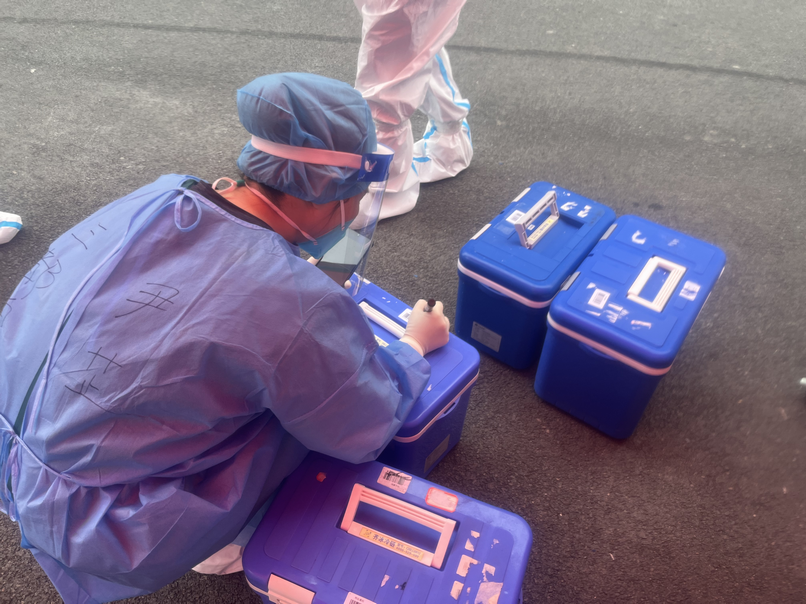 周文雯在核酸检测现场帮居民测体温)