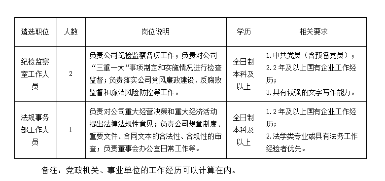 此次面向公司系统内公开遴选工作人员3名,分别是公司纪检监察室工作人员2名、法规事务部工作人员1名。
