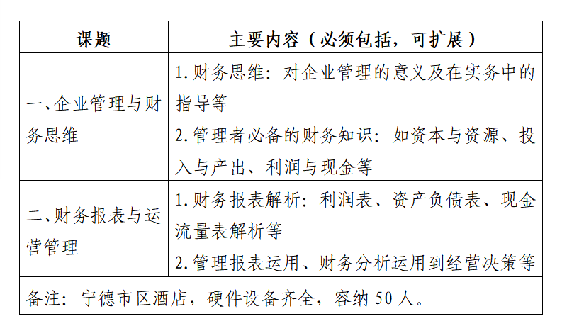 探花系列 拟于近期举办2022年中高管、财务人员培训会,适用于企业中高管及财务人员的相关知识培训,预计50人(为期1.5天),主要关于企业管理人员运用财务报表分析及进行管理决策、财务思维提升的财务知识内容。