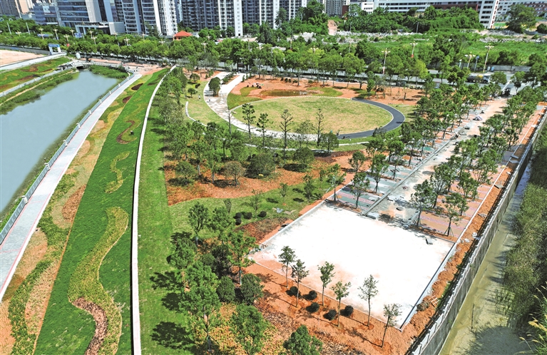 据了解,该项目建设秉承绿色发展理念,堤坝两侧及三角地块均有大面积绿化施工,其中,花化彩化沿河道两侧37225平方米,三角地绿化6000余平方米,透水砖铺设6000平方米,种植香樟、金桂、乌桕、山樱花等绿植达50多个品种。大面积绿化工程,不仅在视觉上给人以美的享受,而且对局部小气候的改造有明显效果,使粉尘、汽车尾气等得到有效抑制,将成为东侨新的“城市绿肺”。