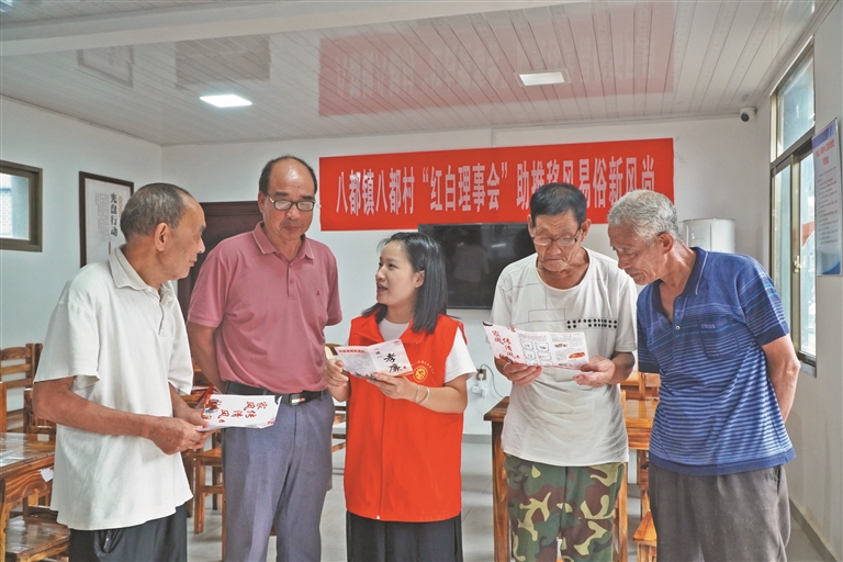 为弘扬社会主义核心价值观,共同倡导移风易俗,抵制陈规陋习,树立文明新风,7月26日,蕉城区八都镇镇纪委、新时代文明实践所等部门在八都村开展“移风易俗破除陈规陋习”主题宣传活动(上图)。通过主题宣讲、发放宣传材料、悬挂横幅等形式,向群众宣传移风易俗、孝善美德等知识,引导村民群众弘扬新风正气,做到婚事新办、丧事简办,抵制陈规陋习,厉行勤俭节约,争做文明新风的积极倡导者和自觉实践者。
