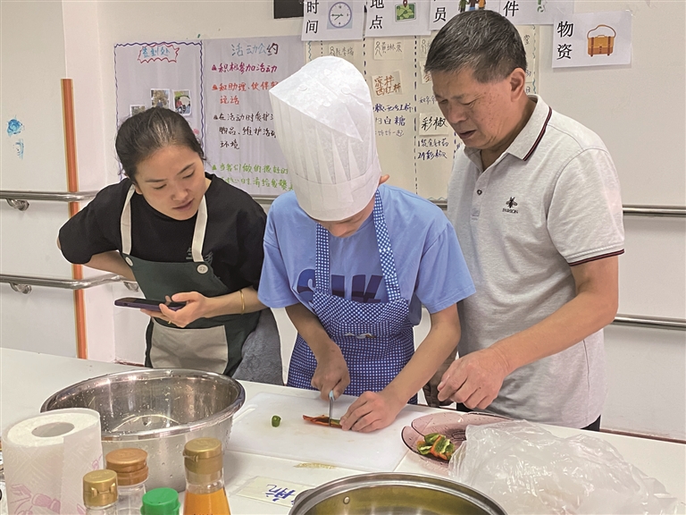金针菇炒甜椒、西红柿炒鸡蛋、凉拌黄瓜……近日,宁德市福乐家园里弥漫着阵阵饭香,在志愿者老师的指导下,多名心智障碍青少年认真学习烹饪实践课程,洗菜、切菜、倒油、翻炒、出锅……虽然反应迟钝,动作缓慢,但是他们学得格外认真。