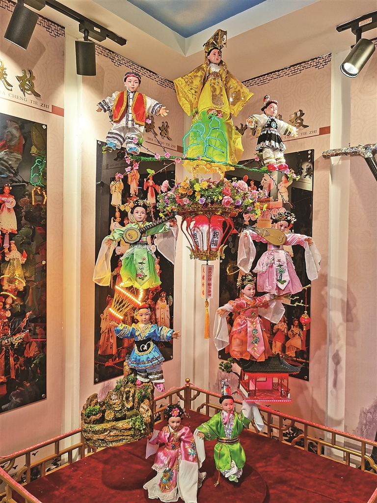 馆内,小型“太姥祈福”的铁枝交叉回旋,仿真的小演员们装扮精美,分层或坐或站,极尽千姿百态。刘端富解释,当地流传着“没看过铁枝,就不算过元宵节”的说法。除了元宵节之外,游客可以到展示馆一睹铁枝风采。