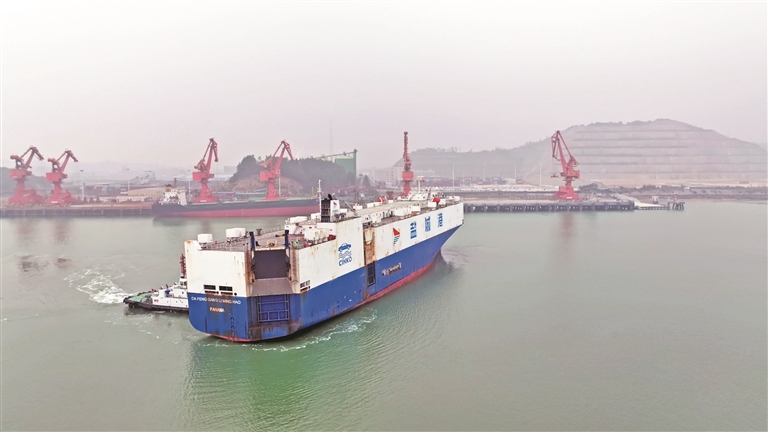 1月2日,上汽宁德基地生产的1172辆名爵品牌汽车,搭载巴拿马籍“大丰港黎明号”滚装船从宁德港漳湾作业区启航出口至墨西哥。宁德出入境边防检查站制定专项勤务方案和应急处置预案,推出整车通关“零等待”、开辟“绿色通道”等服务举措,为2024年口岸首单汽车滚装出口提供优质高效的边检服务。(闽东日报记者 张文奎 摄 )