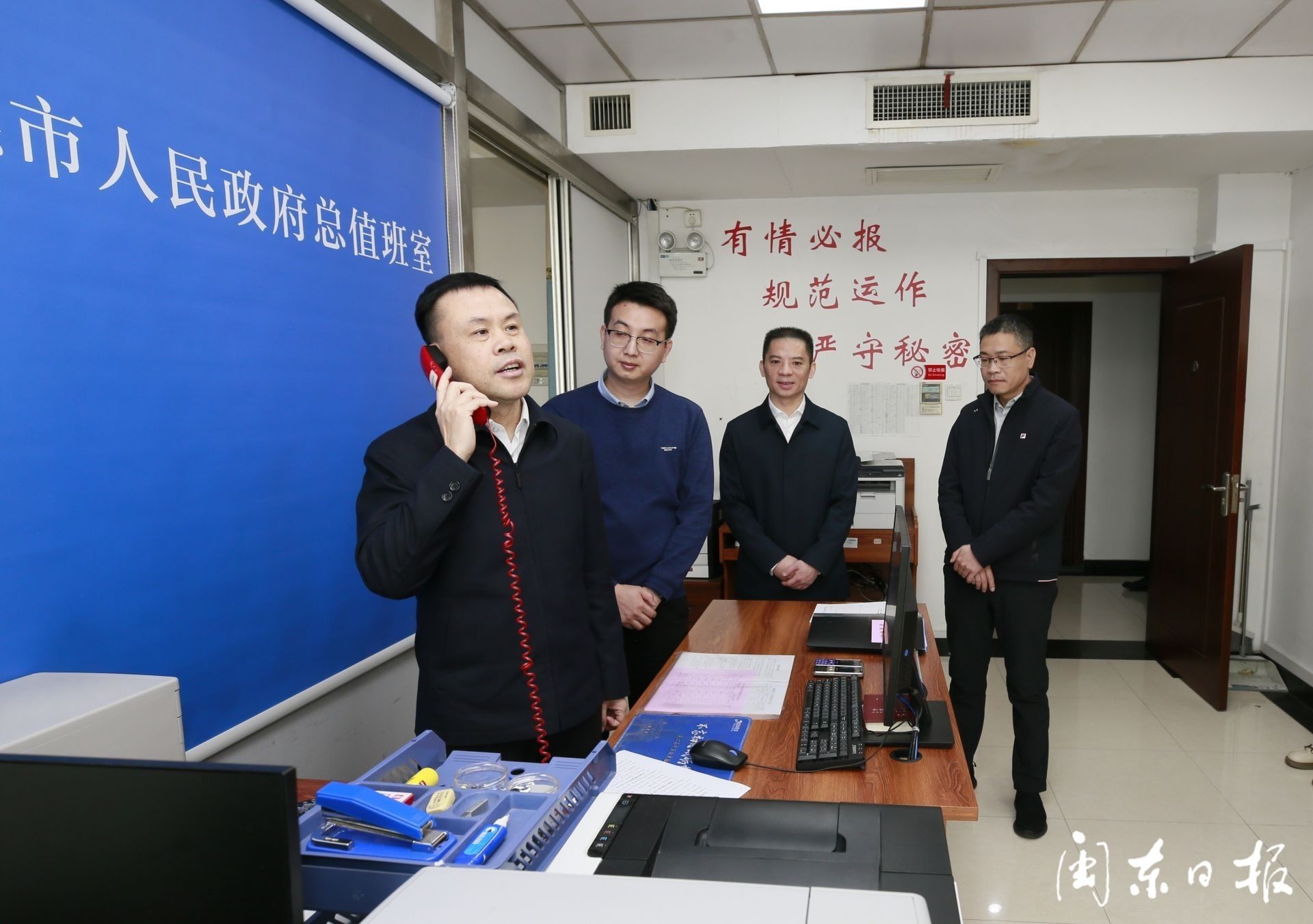 在市政府总值班室,张永宁详细询问春节期间全市值班值守、信息报送、应急处置等情况,并采取电话连线的方式随机抽查职能部门值班带班情况。他强调,全市各级各部门要有“群众过年,干部过关”的意识,要以“时时放心不下”的责任感,严格落实好值班值守工作,确保应急响应快速有力、信息报送及时高效、指令传达准确到位、各项工作有序运转。(闽东日报·新宁德客户端记者 赵巧红/文 徐烽/图)